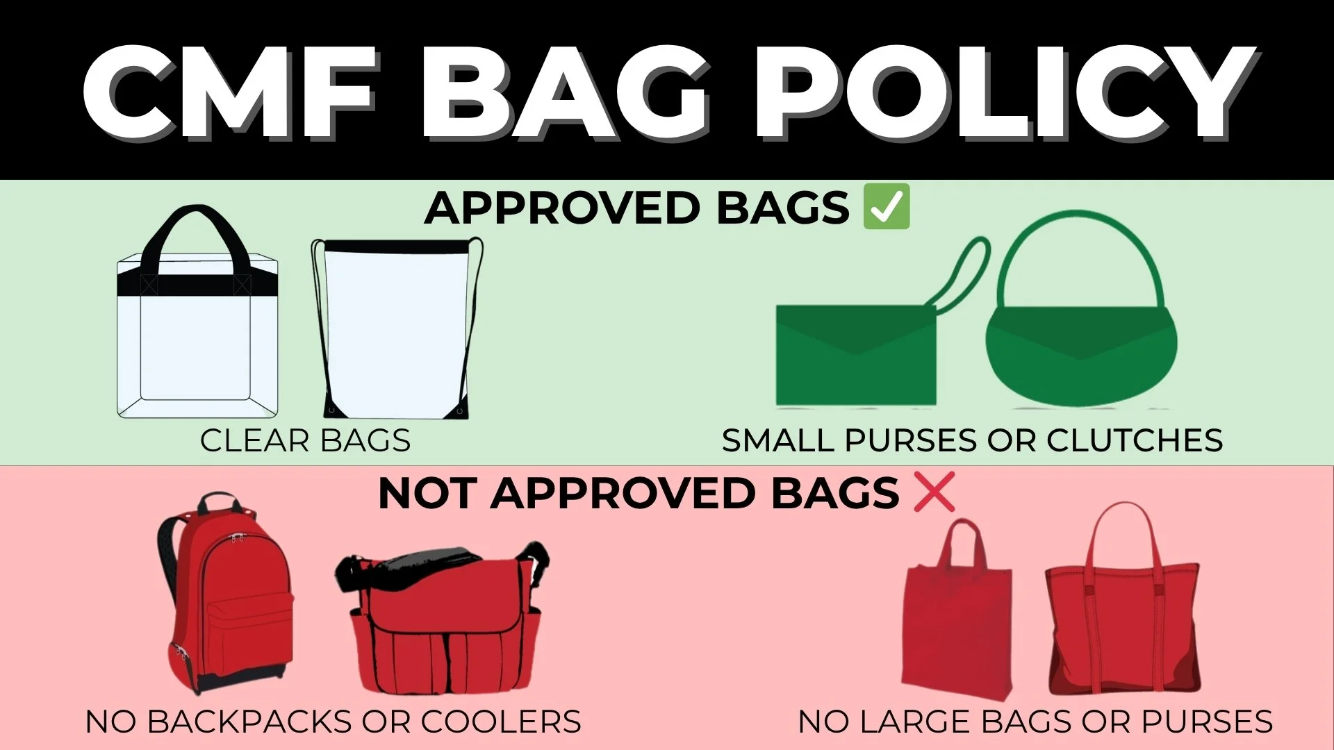 ALLOWED BAGS: Small purses, clear bags, and personal items that can be easily inspected.