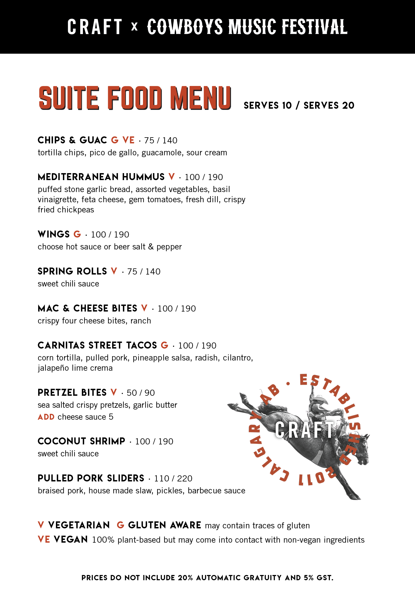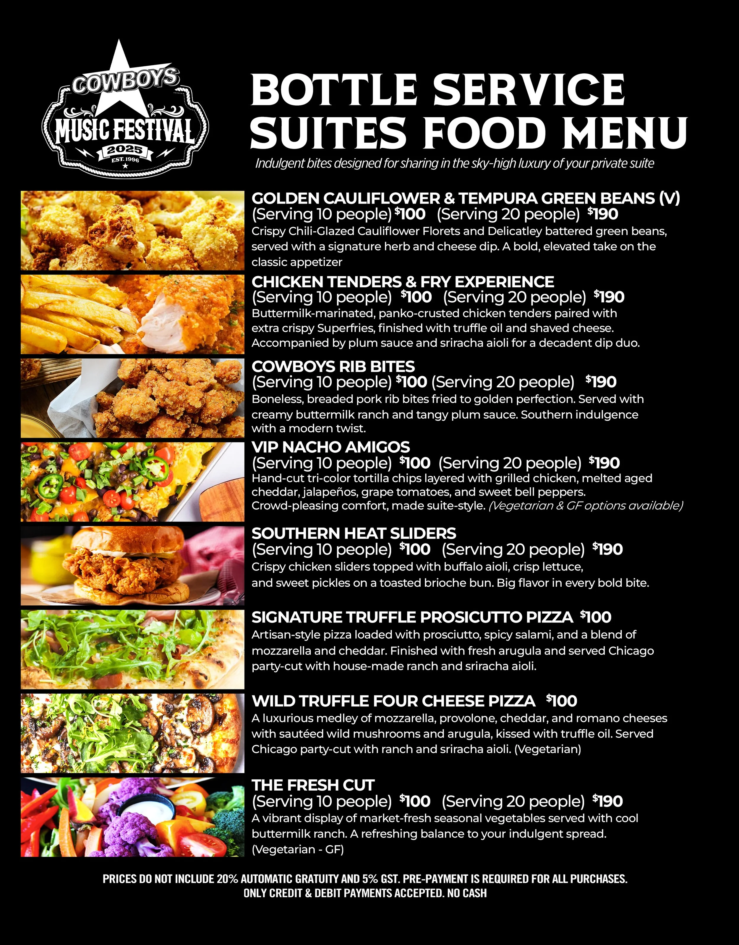 GETTING HERE • VIP WRISTBANDS • SUITE INFO • WHAT TO BRING • FAQ’S • DRINK MENU • FOOD MENU • VIP PACKAGES