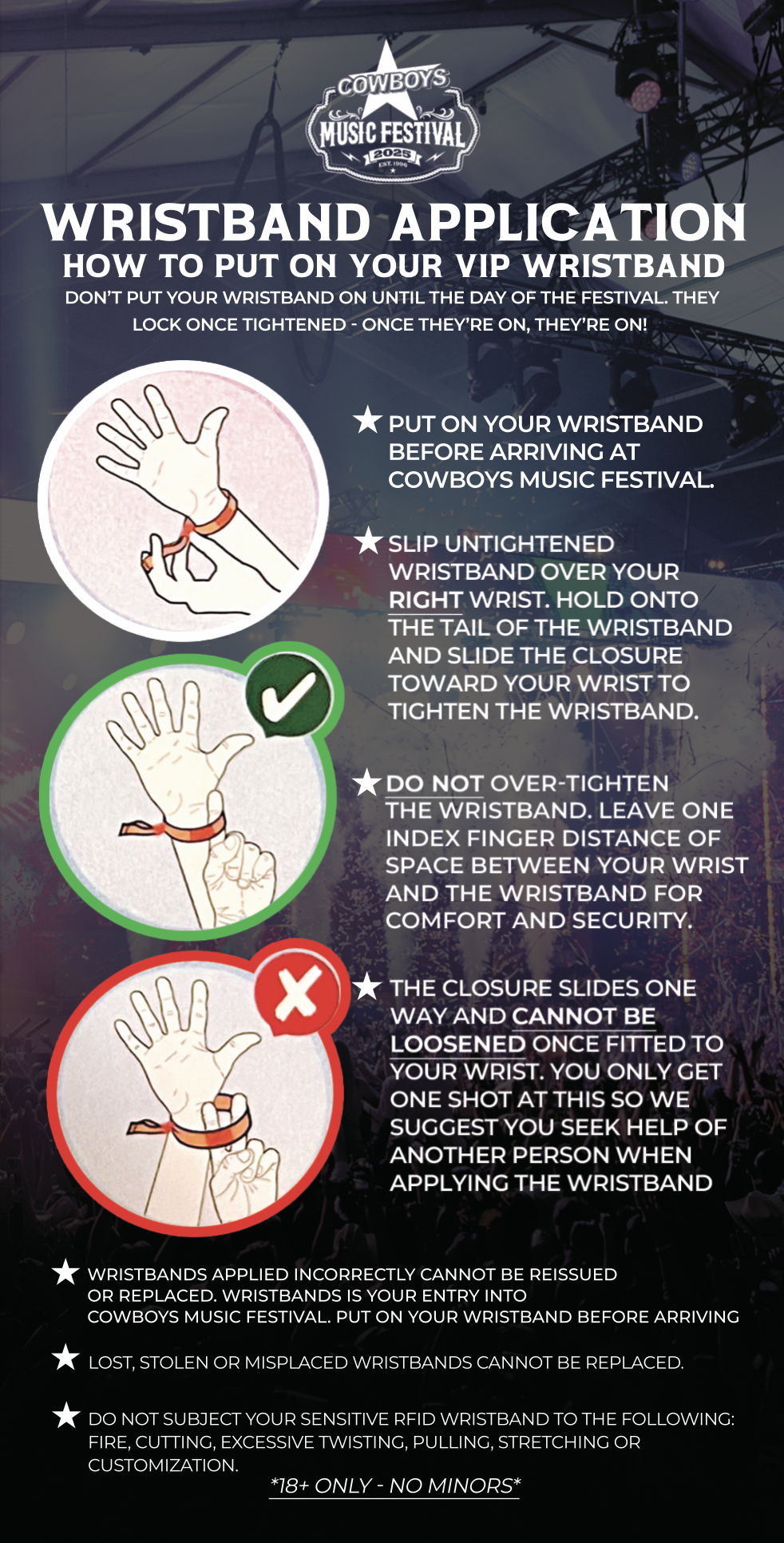 Your wristband is your ticket into Cowboys Music Festival. Make sure to put it on before arriving to avoid any issues at the gate
